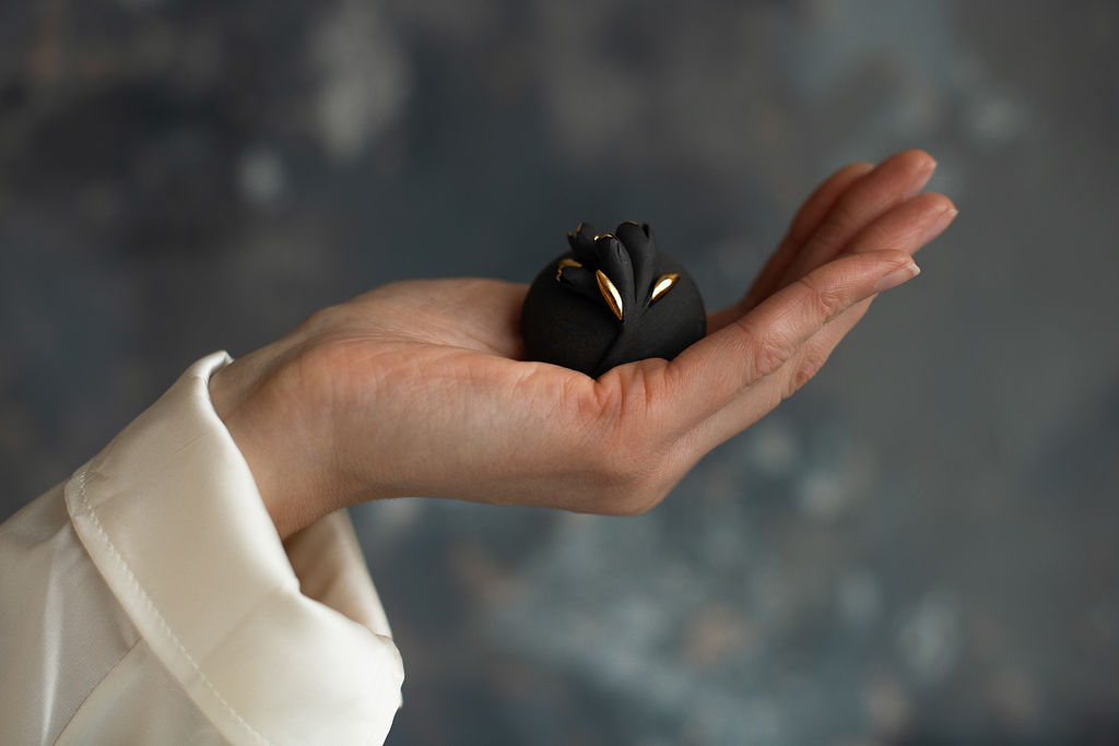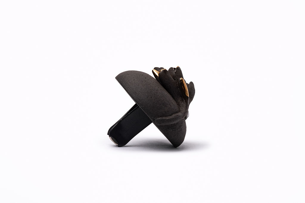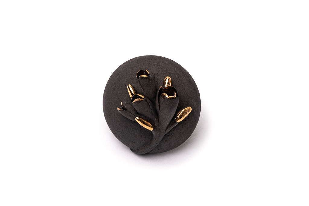 Juodas molis, glazūra, tauriųjų metalų produktas (auksas), metalinis laikiklis.
